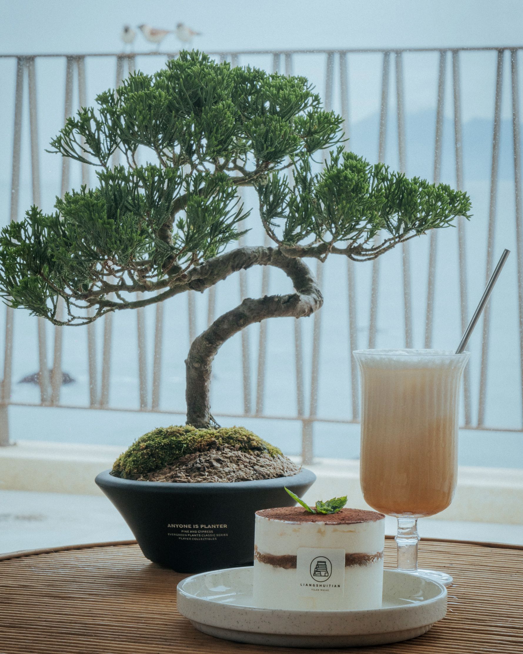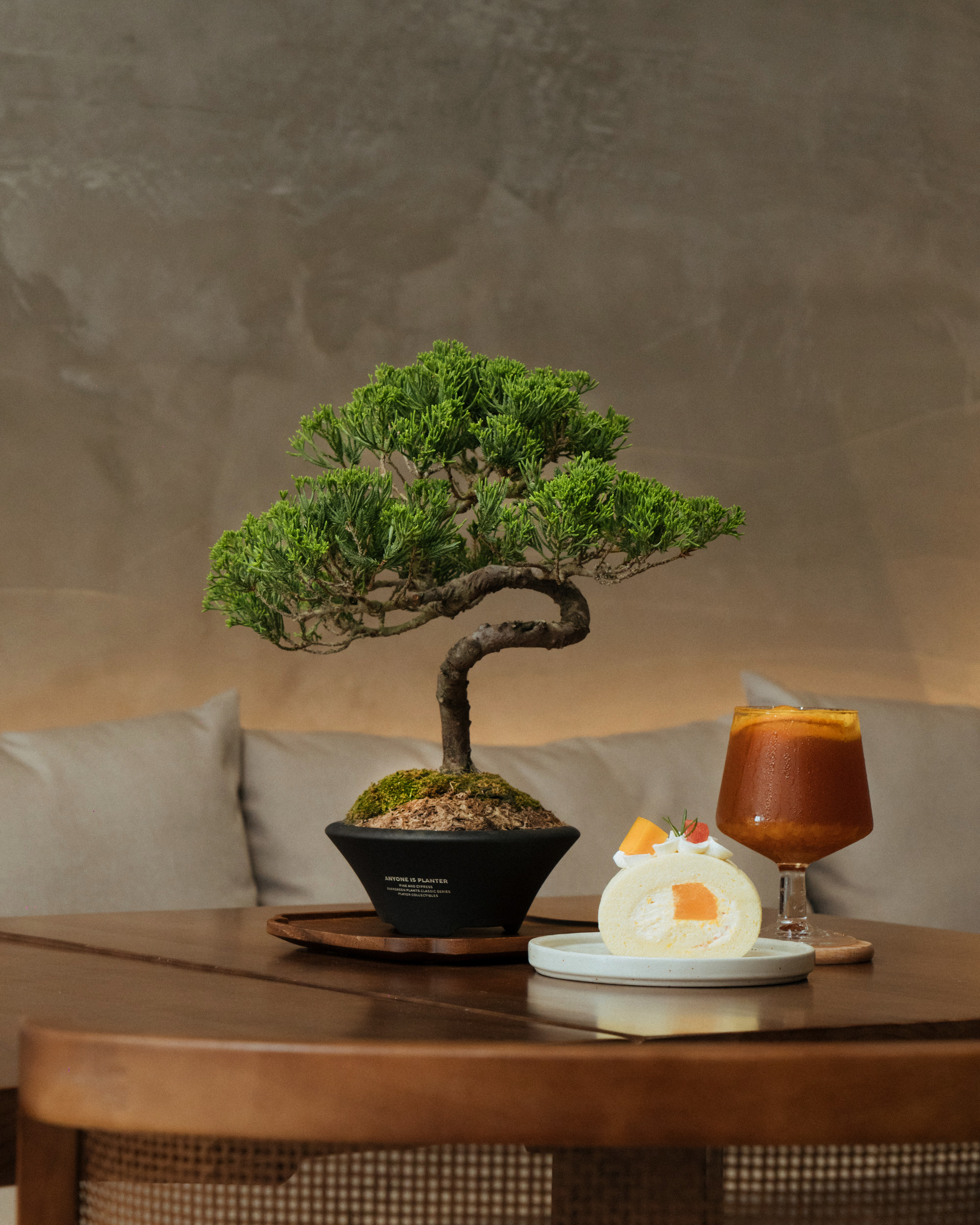 咖啡廳內精心擺放的真柏盆景,增添了一份自然的靈氣與雅致,