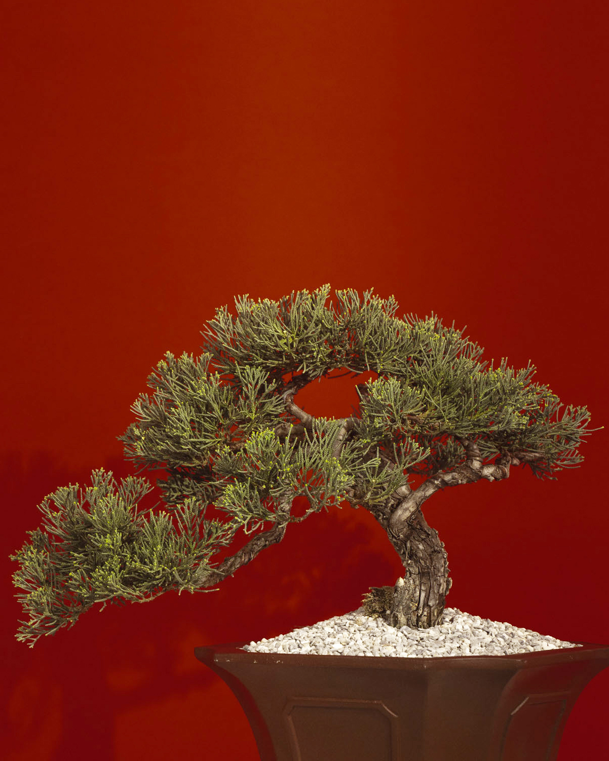 一道獨特的風景,結合了方高盆與真柏葉茂側飄的意境,扭曲有型的樹幹,以及幹粗福氣的氛圍。