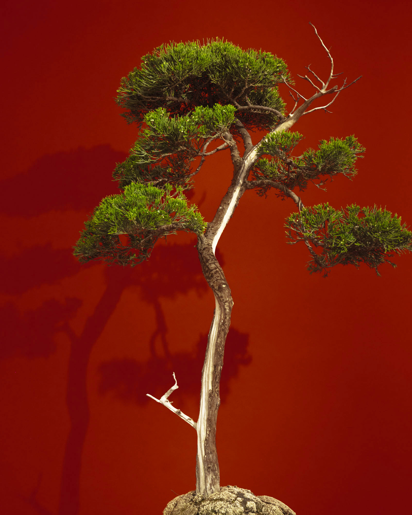 其採用的圓形盆子象徵著圓滿與和諧,與孤枝細長的三飄真柏葉相得益彰,營造出一種清新脫俗的氛圍。