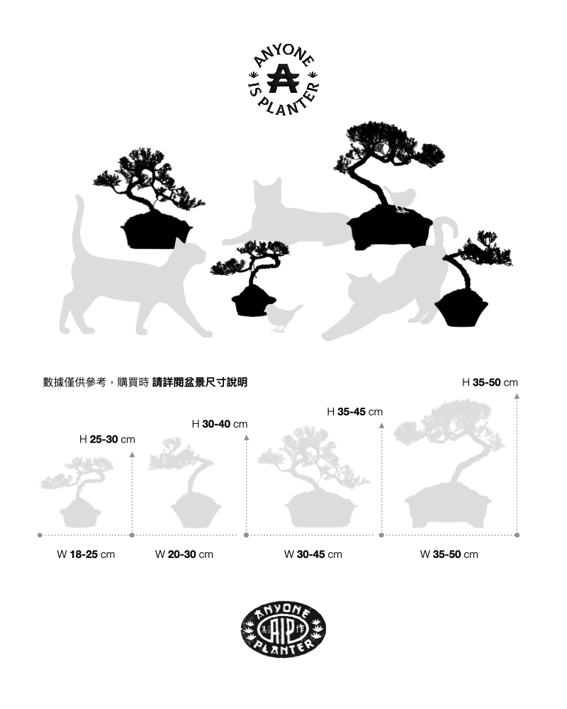 【 風格樣式 】 橢圓盆 曲幹式 小型 【 盆栽尺寸 】 盆栽:H高36cm, W寬21cm, D深34cm(含盆)為整體尺寸參考值 盆器:H高6cm, W寬13cm, H長17cm (盆內:H高4.5cm, W寬10cm, H長14cm) 樹高:30cm 幹粗直徑:2cm(樹幹高與粗度會隨著時間與營養變化而改變) 【 典藏禮品 】 採AIP專員,全省到府寄送服務,外島須與IG小編聯絡。 【 限量精品 】 盆景屬於藝術商品,也需投入養護,請謹慎考量自身條件, 每一盆都是匠心獨具的藝術品,台灣真柏成長於有限的年產量下,每年僅能提供四種盆型,每盆僅約25至30盆。 每盆都手工培育仿造自然神韻,耗時完成,數量有限流通較快,每件作品只有一盆。 【 特別聲明 】 凡購買典藏禮品區商品,24小時內會有專員通過會員註冊時的e-mail,通知您與您確認運送到府相關事宜。 或購買完成後主動聯絡IG小編,我們將有專人為您服務 【 運送時間 】 國定假日不提供運送服務,如需例假日運送,請洽IG小編。 【 禮卡服務 】 暫不提供,未來會開通此服務。 【 購物須知 】 典藏禮品與其他商品時,典藏禮品除外的商品,我們將統一幫您由黑貓宅配寄出。 每盆盆景,每分每秒都在成長,給予適當的照顧與補給所需的營養,在每年的每個季節,都可以去感受這在四季的樂趣,所販售的盆栽皆為素材也為成品,一盆好的盆景,需經過年復一年的雕塑與培育,來達到各種仿造自然神態的美,心與自然合一的境界。 - 雕塑鋁線 - 是師傅施作時固定植物生長方式方向的『暫時性固定』,養植時如發現鋁線正在被樹皮包覆,即可拆除,也可重新施作,靠自己的巧手與意境來重新雕塑樹形。 - 真柏樹幹粗度 - 不能完全代表年份,只能作為年份的參考值,每盆盆栽因表達意境與創作美感不同,選取的素材年份成長方式不同,導致幹的粗細略有不同。 - 盆栽 - 因拍攝到上架與出貨季節不同,盆栽葉茂長短也會不同,出貨前,會統一整理盆栽葉茂姿態。 - 葉茂 - 由於盆景拍攝時期正值雕塑期,剛整理完形體與葉茂,實品會比商品照片其葉茂更來的茂密。 【 Anyone is Planter 修剪服務 】 我們提供一項特殊服務:為了讓您擁有最佳的體驗,在購買後的一年內,每盆AIP盆栽可以免費享受回園區修剪一次的服務,這將確保您的真柏盆景保持美麗和健康,並持久地散發著其迷人的風采。 “完成訂單後:系統將於12小時內啟用一年的保固服務,可至會員個人頁面查詢。” 〖 請注意!此服務不包含運費 〗 但我們將以黑貓宅配收貨方式為您提供寄送服務,讓台灣真柏的永恆之美為您的生活增添綠意和和諧。 【 養護培育 】 真柏小品盆栽還需要定期修剪和整形,以維持其美麗的形態和尺寸。定期除蟲和施肥也是保持其健康和生長的關鍵。若您有興趣,不妨試著種植一株真柏小品,體驗自然與生命的美妙。 而它們需要經過半年的精心養護和培育,以穩定品質,讓每一盆都展現出最完美的姿態,深知這些盆景得來不易,因此,每一盆都以極高的謹慎度製作。 從精心挑選材料到細緻雕琢,將匠人心血注入其中,使其成為一件獨特珍貴的藝術品,擁有這獨一無二的藝術寶藏,感受大自然的神奇力量與百年文化。 團隊每月定期前往產區拍攝,植物為成長階段商品,因季節濕度與成長階段有所不同,而導致每盆植物光影與葉色會些微不同,屬於『正常現象』每只盆栽在拍攝前會進行,盆器擦拭處理與葉茂修整,我們盡可能呈現最自然的樣貌與葉茂,但我們無法掌握自然的美,盆栽土壤上方的水草,也會因為氣候濕度與日曬程度不同,也會造成顏色與濕潤度的不同,皆屬『自然現象』,請放心選購獨一無二的自然藝術品。 【 真柏知識 】 台灣真柏是台灣的原生植物,以其矮小的生長形態和綠色的葉片,在園藝上得到了廣泛的應用。台灣真柏小品盆栽種植已經有數百年的歷史,是一種經典的園藝品種。真柏小品盆栽有著很高的觀賞性和美感,其精美的姿態和多樣化的造型,能夠很好地裝點室內和室外的環境。 除此之外,真柏的綠色葉片和柔軟的質感,更能為人們帶來一種療癒和放鬆的效果。要種植出一株健康美麗的真柏小品,需要特別注意其生長環境和管理。真柏偏愛溫暖潮濕的環境,生長在陰涼潮濕通風有陽光的環境中,可以達到最好的生長效果。在盆栽種植中,非常適合各階段玩家,選擇適當的土壤和肥料也很重要,以確保植株營養均衡,健康成長。 【 盆器說明 】 特製專屬顏色PANTONE BLACK C紫砂黑, 古法手製窯燒,每只盆器經受打磨及高溫,窯燒製過:程使『黑』獨特安靜,炙淬而生 盆底商標工匠手工拓製,獨特印記僅此唯一 底部多鋁線孔,專為『盆景盆器』設計而生-限量盆器,釋出99只製作紫砂盆器是一門古老的手工藝, 需要經過多個精細的步驟才能完成。首先,工匠們會仔細地篩選出適合製作的原料,包括紫砂泥、白砂、紅砂和石英砂等。接著,工匠將這些原料和適量的水混合,經過攪拌和篩網處理後,形成均勻的泥狀物質。然後,工匠們開始手工塑形,打造出不同形狀的盆器,如壺、罐、盆等。在這個過程中,他們需要不斷調整和修整,以保證盆器的美觀和使用性能。最後,經過高溫燒製和上釉處理,製作完成的紫砂盆器光澤度高,材質堅固耐用。整個製作過程需要工匠們的耐心和技藝,才能製作出高品質的紫砂盆器。 A small, custom-made exclusive color of PANTONE BLACK C Zisha black, made by traditional handmade kiln firing. Each pottery has undergone polishing and high temperature firing, which makes